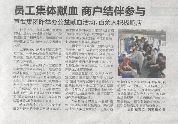 2017年4月22日,《都市晨報(bào)》對(duì)宣武集團(tuán)職工無償獻(xiàn)血活動(dòng)進(jìn)行報(bào)道,彰顯了宣武社會(huì)正能量。